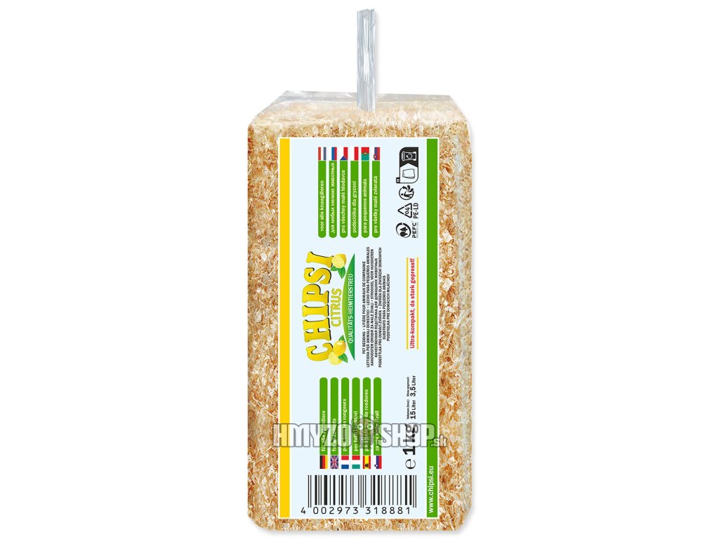 Hobliny Chipsi Citrus sú prírodná podstielka z mäkkého dreva s jemnou citrusovou vôňou, ktorá pomáha neutralizovať nepríjemné pachy a udržiava svieže prostredie v klietke.